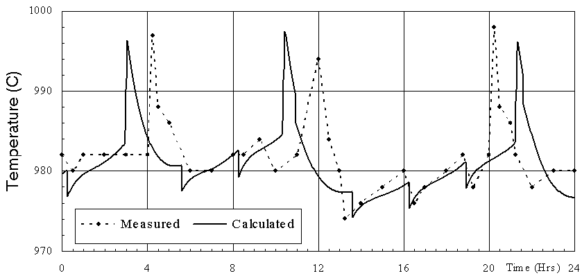 · the temperature drop at each crust break; We can deduce the same conclusion from figure 5 which compares the time history of the alumina concentration. Again the model reproduces every feature of the dynamic evolution, namely