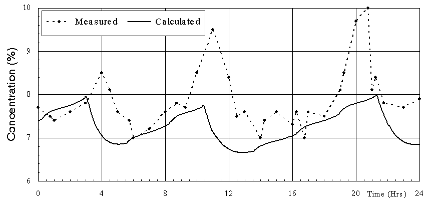 Figure 5: Measured vs. calculated alumina concentration. Note that there seem to be two points in the measured data (figure 5) which are not consistent with the expected behavior of the cell. These are close to the 9 and 14 hour mark and should be discarded. The comparison of the % excess AIF3 dynamic evolution is presented in figure 6. Two observations are noted: