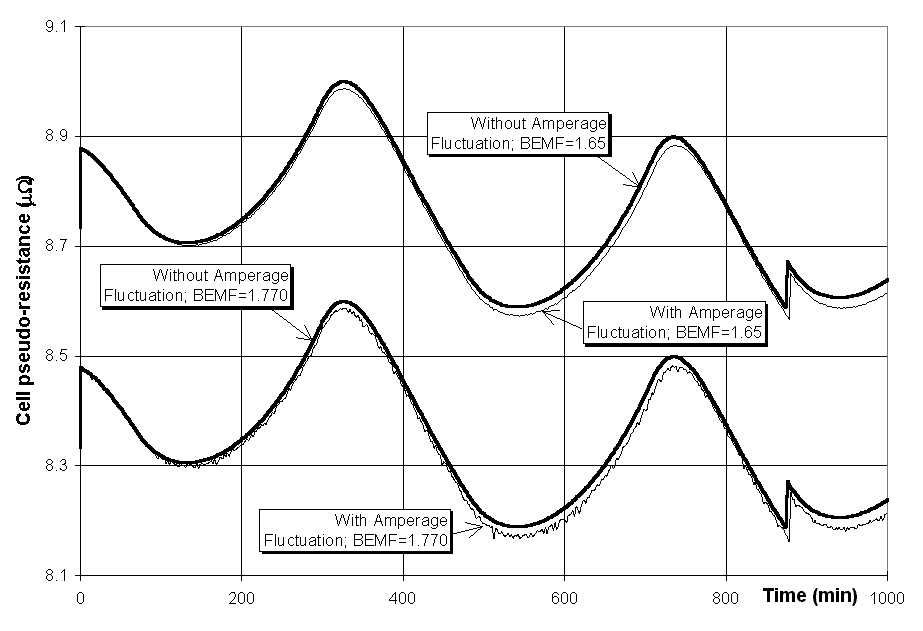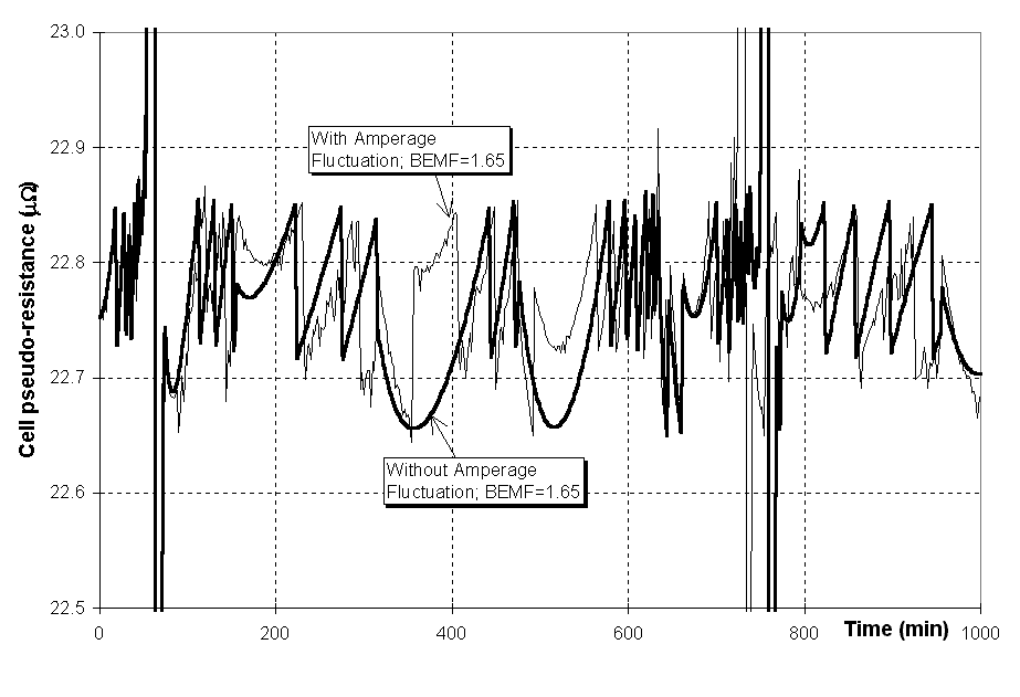 The evolution of the cell voltage and the pseudo-resistance with and without amperage fluctuation are shown in figures 9 and 10 respectively. The smooth solid line shows the case of no amperage fluctuation.
