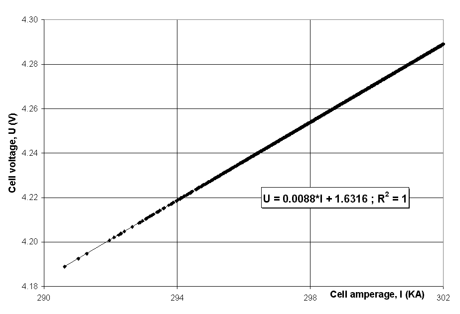 reduction in cell amperage. The net effect is an upward shift in the curve resulting in the higher intercept. Hence, one has to be careful in the selection of the target variable not to impact the cell resistance and generate the wrong result.
