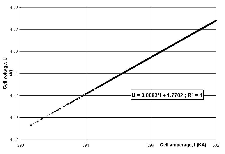 Figure 2 - Correlation between the cell amperage and the cell voltage (PBF cell with the cell temperature as the target variable). With this setup, the value of the zero current intercept is increased to 1.770V (see figure 2). A decrease in temperature, as shown in figure 3, will cause an increase in the bath resistivity and hence an increase in the cell voltage. This increase is offset by the reduction in voltage due to the |