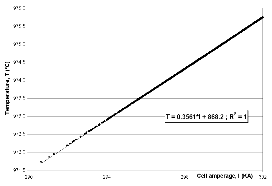 Figure 3 - Correlation between the cell amperage and the cell temperature (PBF cell with the cell temperature as the target variable) More importantly, one has to be careful what experimental data should be used to calculate the BEMF. The wrong information may lead to quite a different conclusion. Efficiency of the BEMF to Filter Amperage Noise It is unrealistic to assume that the temperature dynamic evolution can follow line amperage fluctuation. Hence, the best possible value of the BEMF to use in calculating the cell pseudo-resistance is 1.632V. We will now run the model in dynamic mode with and without amperage fluctuation activated. We will also use the "standard" value of 1.65V for the BEMF (assuming that we don´t know better). We want to investigate how well we are able to filter out the impact of the amperage fluctuation on the dynamic evolution of the cell pseudo-resistance. Figure 4 shows the amperage variation with time as calculated using the amperage fluctuation submodel. The nominal current of 300 kA is also shown on the figure. This curve is typical of the fluctuations recorded in operating pot lines.