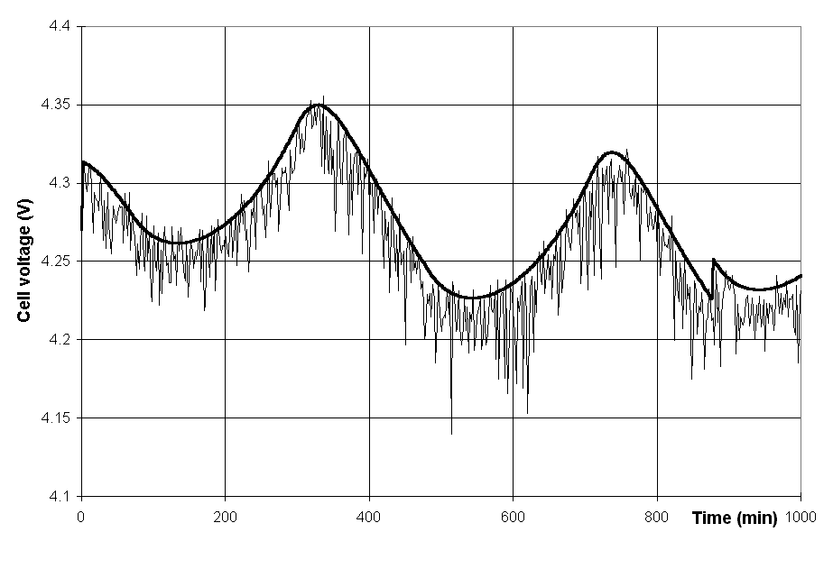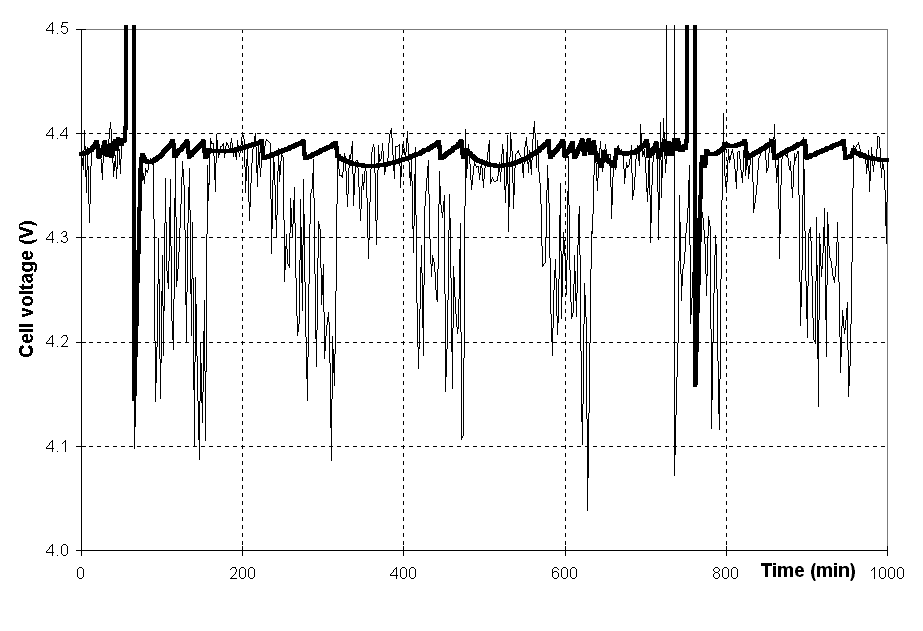 Figure 9 - Dynamic evolution of the cell voltage (Side break cell with BEMF=1.65V). This time, as we can see in figure 10, the amperage fluctuations are significantly affecting the dynamic evolution of the cell pseudo-resistance.