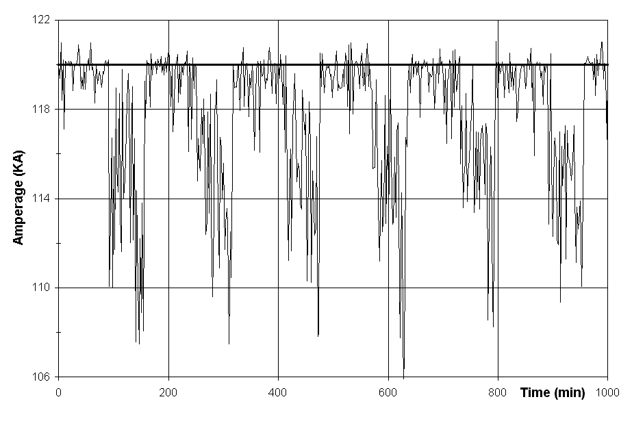 Figure 8 shows the amperage fluctuation over time synthesized by ARC/DYNAMIC based on the probability distributions defined for the model. Notice that for the side break cell technology, the amperage fluctuation is characterized by a cyclic pattern that corresponds to the potroom side break feeding cycle. Furthermore, we notice a significant drop in the line current at the end of the feeding cycle when the probability of having many cells in the line in anode effect is high and the rectifiers have reached their maximum power output. |